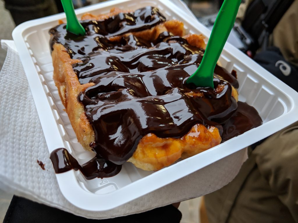 Next on our list we had waffles to try, so we headed down Rue de l’Etuve towards Mannekin pis, who was dressed as a blind man for Braille Day. It was a bit comical to see the mass of people surrounding such a tiny statue tucked into a corner. Along Rue de l’Etuve you’ll find waffles, waffles, waffles, and souvenirs. Not having much else to go on, we tried to peek at their waffle stacks to see which looked the freshest, but all the shops had stacks of already made waffles sitting, so we simply walked into a shop and grabbed a waffle with chocolate. Luckily the waffle was served warm and the chocolate sauce was excellent and not too sweet.