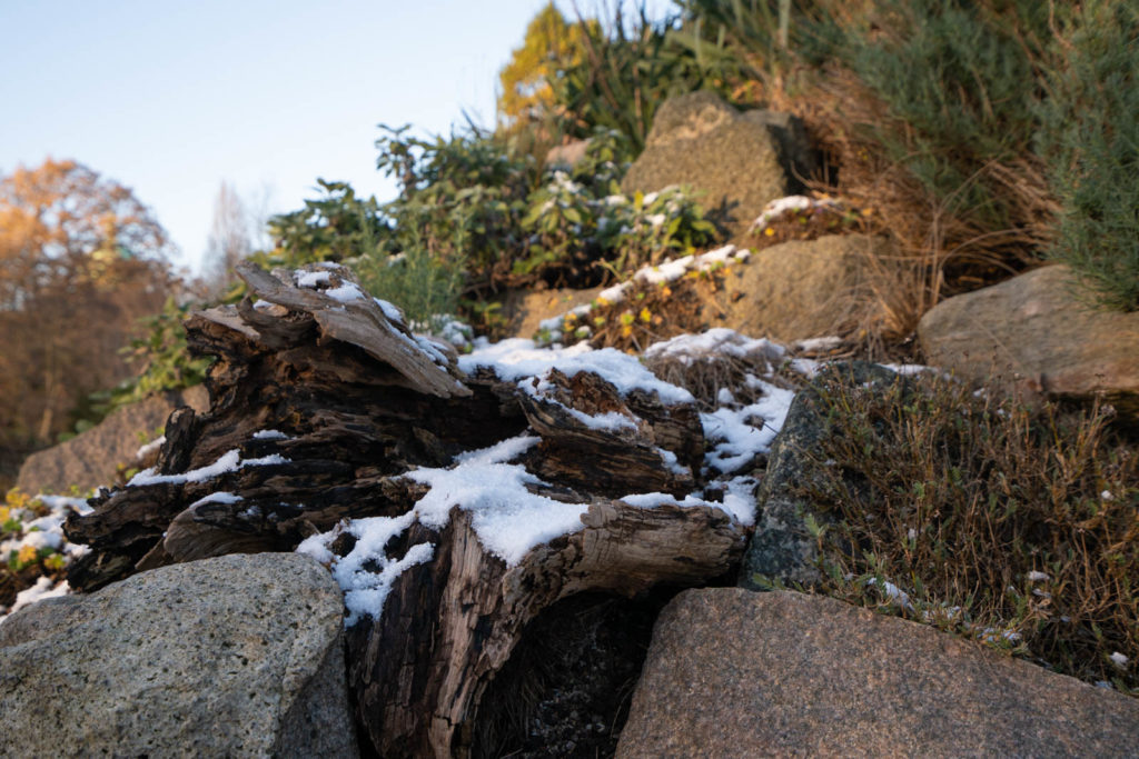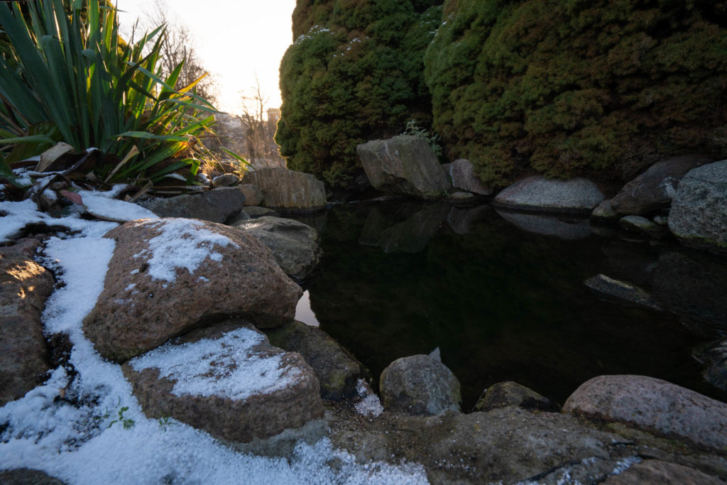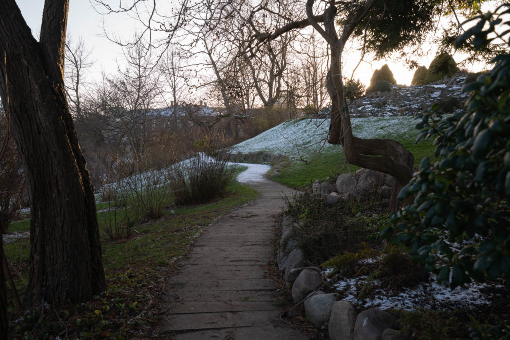 Similarly we got to enjoy the Botanical Garden mostly to ourselves. Just across the street from the King’s Garden, the garden is scaped much more organically and the paths curl for better meandering. We wound our way around the lake, the fowl unperturbed by the chill, and up a short hill where a tiny black pond spilled down into a little waterfall that streamed down the hill. Small fluffy piles of snow sat nestled about the plants and rocks. We tossed handfuls of the fresh snow into the pond, watching the sparkling white flakes catch the sunlight before disappearing into the dark shadowy water.