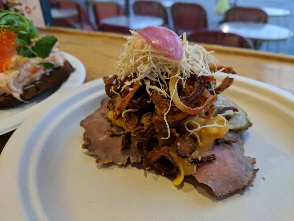 Our first stop was Hallernes Smørrebrød, typical Danish open-faced sandwiches, some topped with fried onions and beef or tuna and roe. The difficulty is, if you purchase food from a stall, there’s really no seating indoors. Most seating indoors belongs to the restaurants and while there’s plenty of seating outside, it just wasn’t ideal in the cold. After trying to covertly wolf down our smørrebrød at the edge of a counter, we decided we would take anything else we found back home.