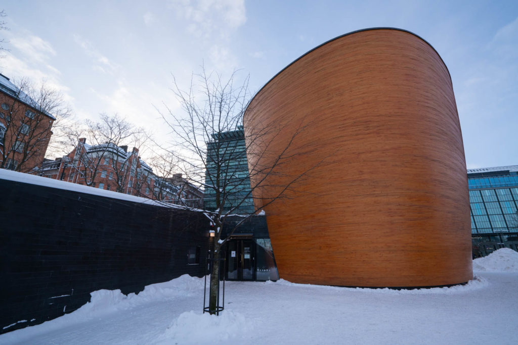 Kamppi Chapel (Kampin kappeli) also known as the Chapel of Silence, kampinkappeli.fi, Simonkatu 7 – Almost funnel shaped little chapel wrapped in wood with a cozy and simple interior reserved for silent reflection. It goes without saying, no noise is allowed inside.