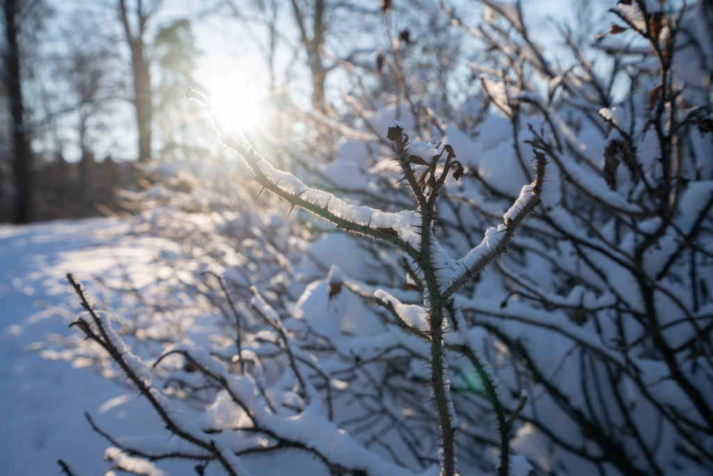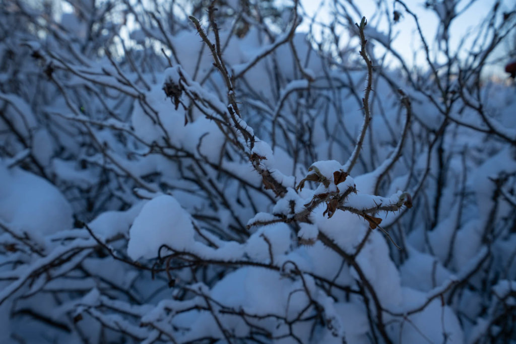 We hiked past a swamp and the sudden openness after all the trees is breathtaking. Further along and we reach the old trees, you can actually see the spiral in the trunk as it grew. As our journey comes to an end, we visit the historical farm village area, the faded reds and yellows add to the rustic charm. We spot some tiny tracks and follow them into the old barn, where an old machine sits idle. A single bird flits past us to a nearby bush and drinks some of the snow, its bright yellow striking in the muted scene. With that picturesque moment we wrap up our winter hike and head back home.