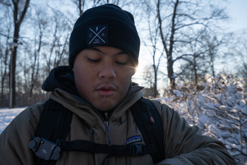We hiked to a campfire where I attempted to chop wood for the first time, there were a number of failed attempts: the key is clearing the way and then letting gravity do the work. Tomas builds the fire in a nest shape, attempts to light some paper and twigs, but when it fails he pulls out his secret weapon: lighter fluid. When the fire finally catches, it’s like color roaring to life, an angry saturation rebelling against the white and blacks of the winter around us. Huddling around it we cook sausages, eat sandwiches and drink our hot cocoa. After our lunch, we pack up the little camp and head back out.