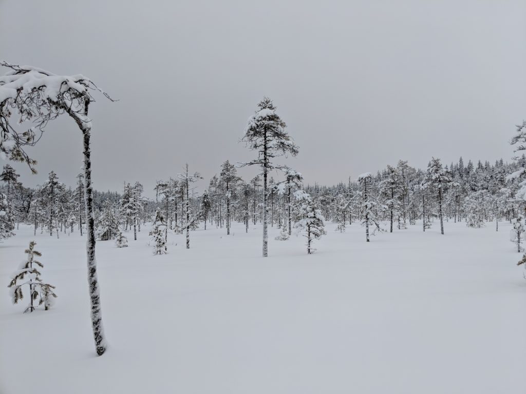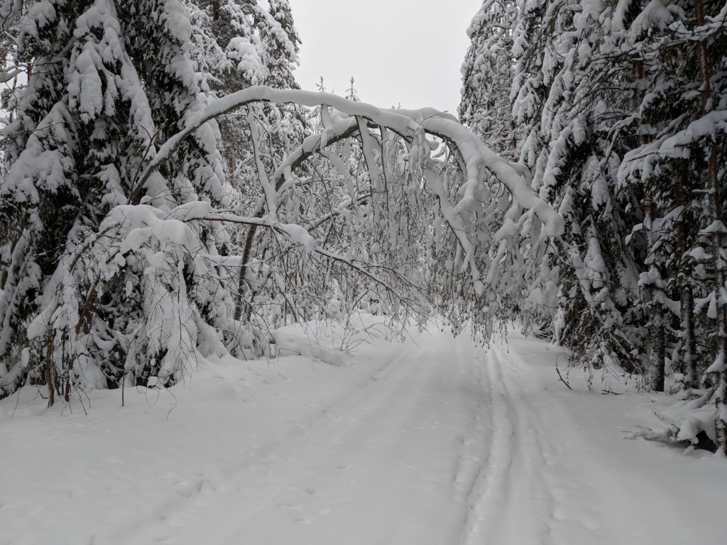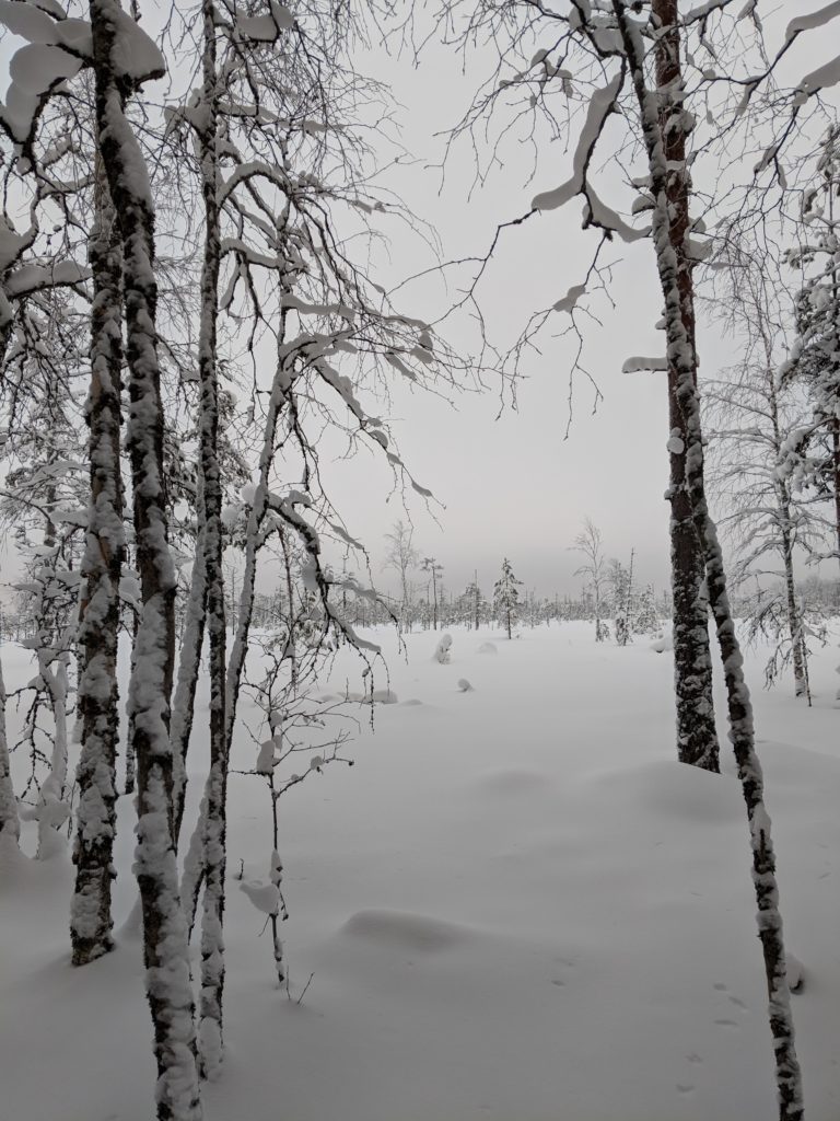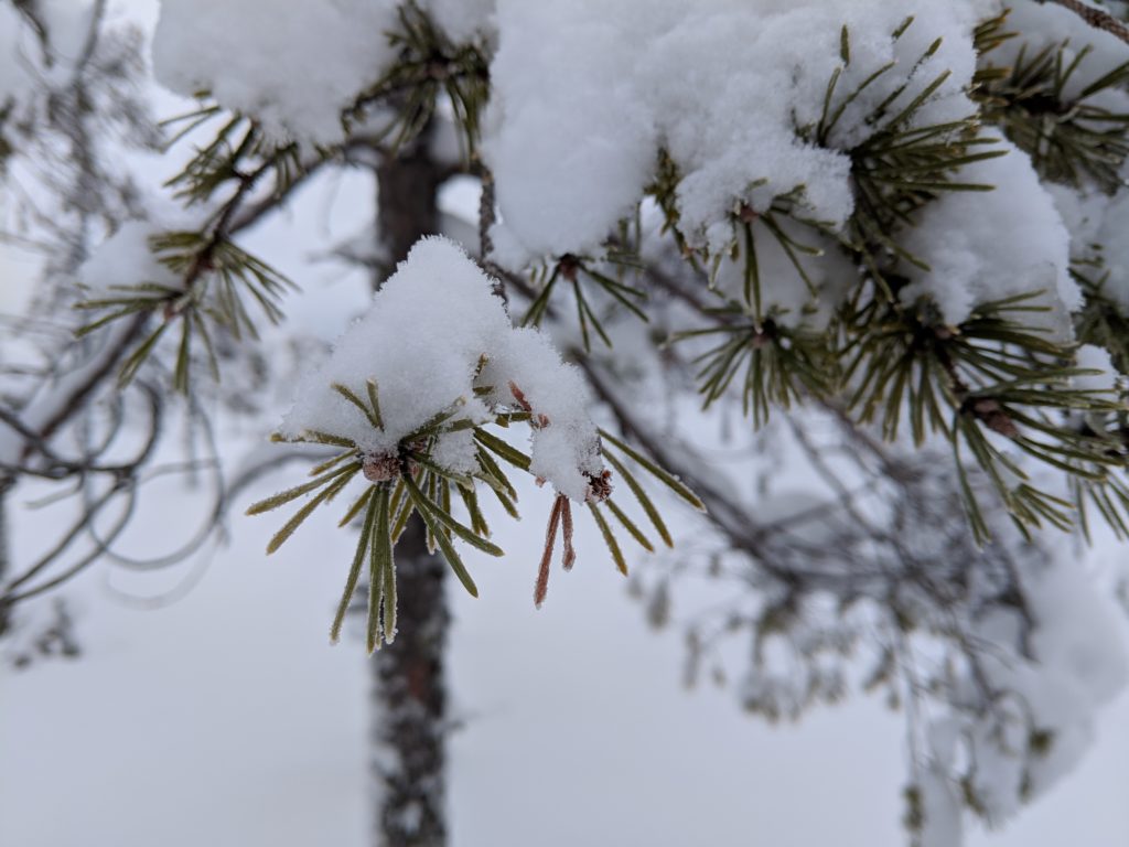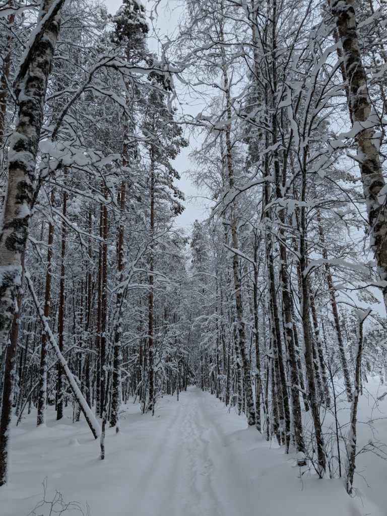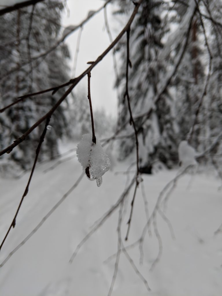 The Seitseminen National Park stretched like an endless untouched carpet of snow, trees lining the edges, melding into the gray dusky sky. The snow was so thick here, I finally understood the phrase “laden with snow” looking at all the bowed trees. We blindly followed Tomas and Lin, turning surprising curves along the unseen path; our crunching boots were the only signs of energy out in the quiet fields of white. Snow crystalized on the branches and yet those sprawling mounds of soft fresh snow, everything felt so pristine and delicate, so delicate that some impish part of me was tempted to plow through it all. Break the stillness, test the form! There was something so spectacular about being on in the wintry wilderness and experiencing this magical element of snow: natural, pure, harsh, cold, soft, round, sparkling, sharp, opaque, clear.