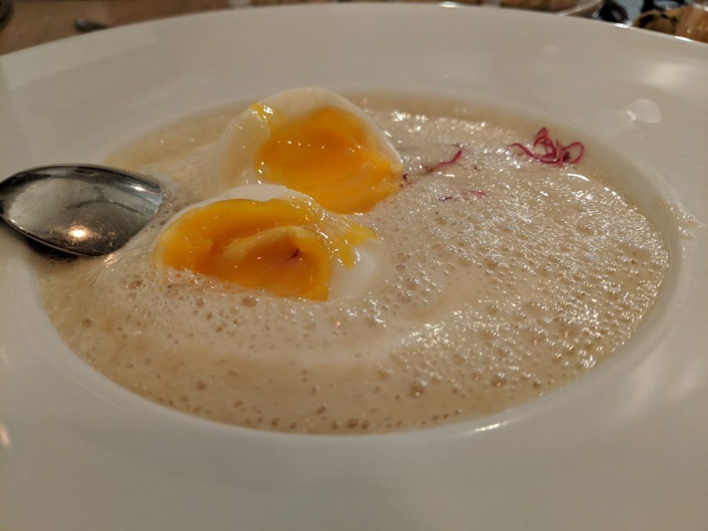 - Cappuccino coco a l’oeuf mollet, emulsified coco beans frothed like a cappuccino and a poached egg, rich and earthy