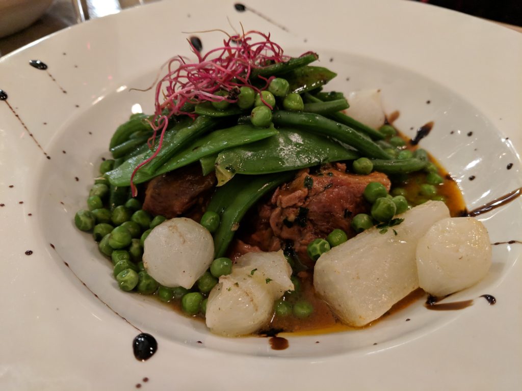 Main course of the night: My sister-in-law and I had the slow cooked lamb, Adrienne with her scallops and my brother had the Argentinian steak with frites (fries…my weakness). Main dishes were still delicious but at this point I was still dreaming of the Foie. The lamb was slow cooked to perfection, soft and flavorful stew topped with an enormous amount of peas and snow peas. Adrienne’s scallops (her favorite) had the right amount of sear. The Argentinian steak was cooked to the right medium rare with rock salt served alongside for you to add as you wish. The salt really brought out the flavor of the steak. Main course did not disappoint and successfully carried the food high we had coming from the starters.