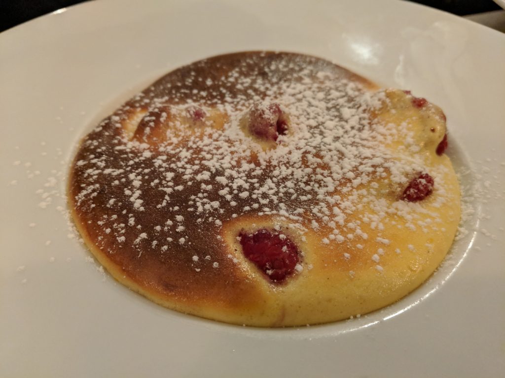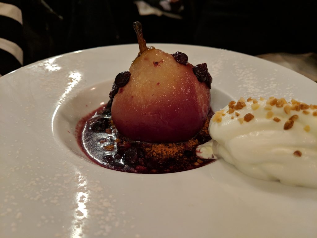 Finishers of the night: Normally we pass on dessert but honestly talking with Frederick and us getting to enjoy each other’s company after a busy stint back home we didn’t want the night to be over. As Frederick was about to pass the dessert menus we asked him what his favorites were. He then asked “do you trust me?” But at that point we trusted him with our lives if it came down to it. He said he would bring us two desserts of his favorites so we agreed. One of his favorites, a chocolate lava cake a la mode and a hot sabayon. He then surprised us with a roasted pear as a gift for “being his favorite table of the night”. I’m not a big chocolate person but the cake was excellent. Moist flavorful cake with a gooey dark chocolate center paired with the vanilla ice cream was a great first bite for me. The roasted pear topped with a sort of black currant sauce was a surprise! My only other experience with pear as a dessert was again in culinary school where I had to make a red and white wine poached pear. That’s about all I remember so I probably didn’t make it that well. This roasted pear dish was cooked perfectly. Soft with just the right amount of texture and bite to not be mush. The sauce was sweet but didn’t overpower the flavor of the pear at all. The sabayon took the prize for best dessert. If you’re not familiar with sabayon, it’s a dish that can be served hot or cold, in our case hot, and is a custard with fresh fruit on the inside with the top being either baked or torched (like creme brûlée) to create different textures for the topping. The custard; light yet flavorful of fresh vanilla bean and the fruits (grapefruit, grapes and berries) soft and mild in their flavor as if someone stared at a clock to pick them at the right moment. The fruit flavors didn’t overpower the custard at all and the topping was like a toasted crepe.