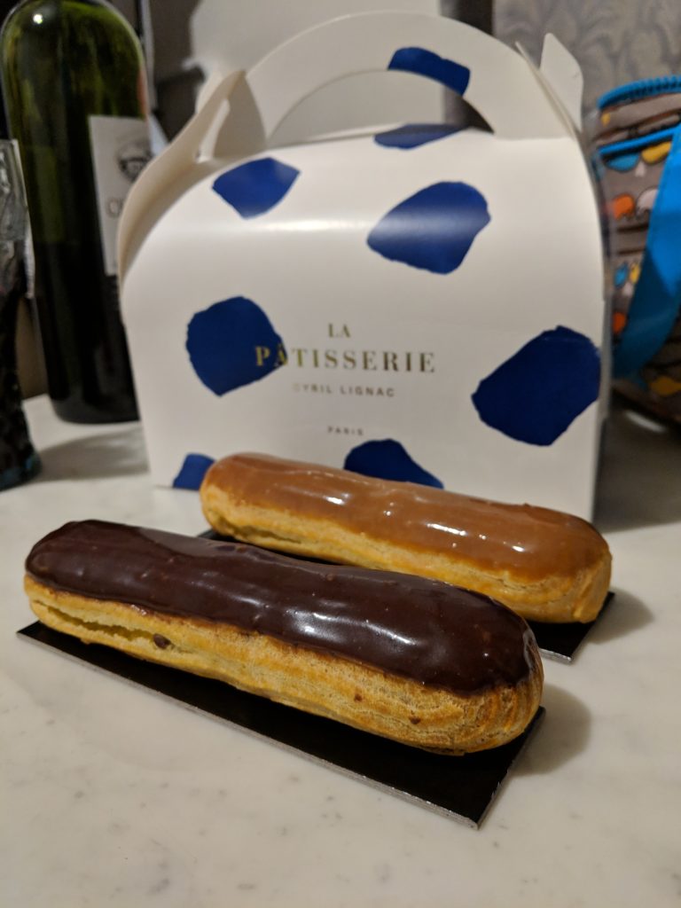 - La Patisserie Cyril Lignac, 5 EUR, chocolate and caramel flavors. Very tasty and comes in a cute box. It held well over the course of the evening, very thin crust and not too sweet.
