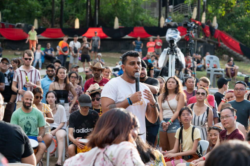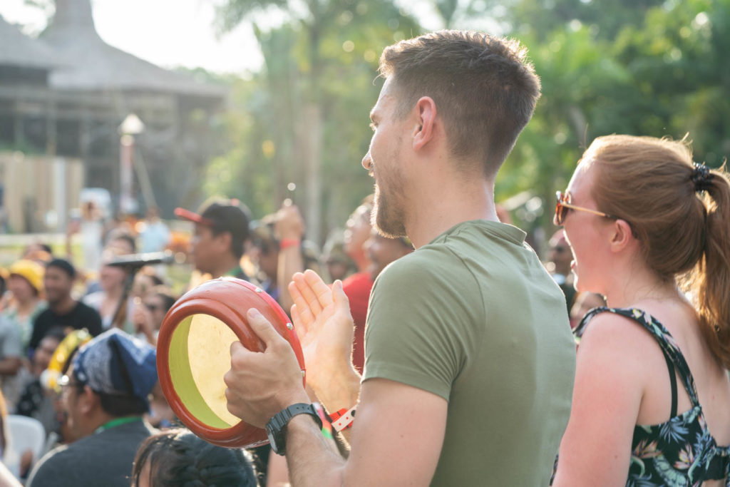 After the hype of Day 2, Day 3 will feel like a mass exodus, but there was still more of a crowd than Day 1. We did some final browsing at the bazaar and grabbed our dinner to go over at the Arena Grounds so we could hold our spot for the final show. Each day, just before the main stages fill, there’s a Calling of the Tribes and Drum Circle on the Arena Grounds. The Drum Circle is great for kids and adults alike, everyone gets a percussive instrument and the group attempts to make some music!